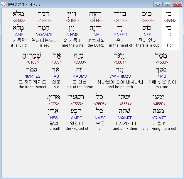 히브리어구약BHS,8 כִּי כֹוס בְּיַד־יְהוָה וְיַיִן חָמַר מָלֵא מֶסֶךְ וַיַּגֵּר מִזֶּה אַךְ־שְׁמָרֶיהָ יִמְצוּ יִשְׁתּוּ כֹּל רִשְׁעֵי־אָרֶץ׃