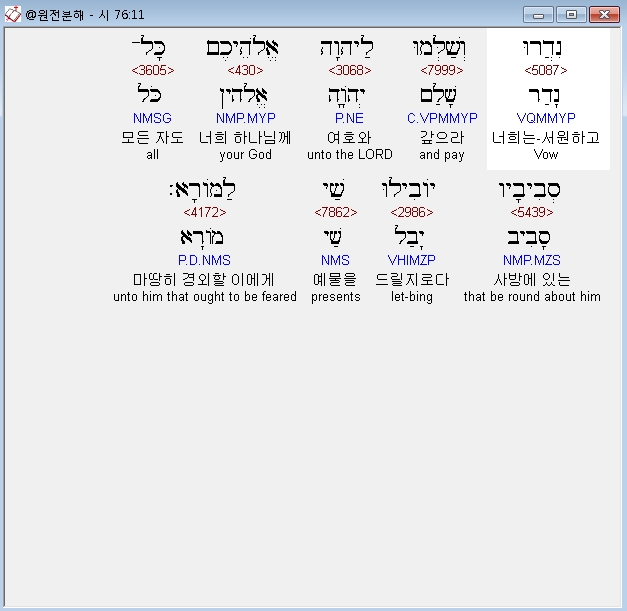 히브리어구약BHS,11 נִדֲרוּ וְשַׁלְּמוּ לַיהוָה אֱלֹהֵיכֶם כָּל־סְבִיבָיו יֹובִילוּ שַׁי לַמֹּורָא׃