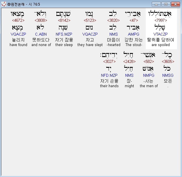 히브리어구약BHS,5 אֶשְׁתֹּולְלוּ אַבִּירֵי לֵב נָמוּ שְׁנָתָם וְלֹא־מָצְאוּ כָל־אַנְשֵׁי־חַיִל יְדֵיהֶם׃