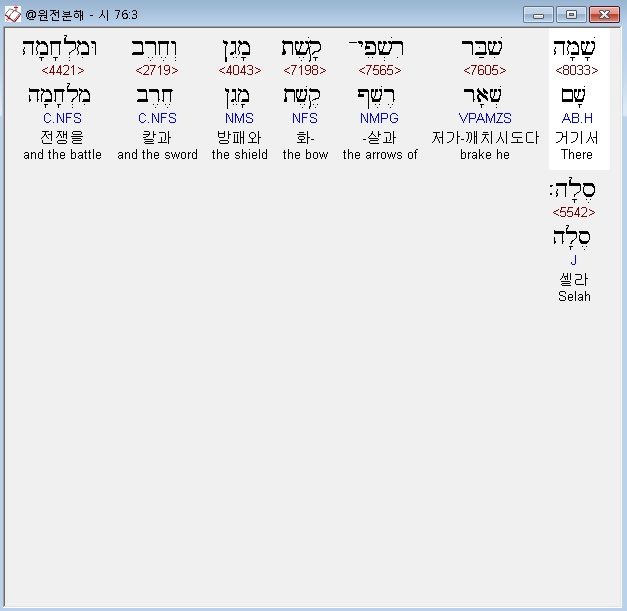 히브리어구약BHS,3 שָׁמָּה שִׁבַּר רִשְׁפֵי־קָשֶׁת מָגֵן וְחֶרֶב וּמִלְחָמָה סֶלָה׃