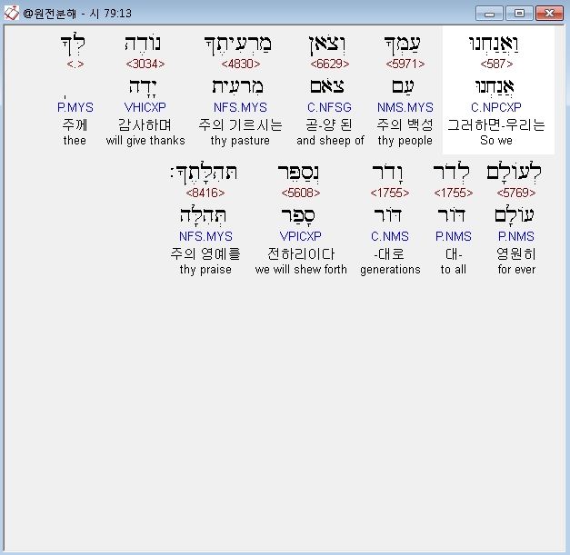 히브리어구약BHS,13 וַאֲנַחְנוּ עַמְּכָ* וְצֹאן מַרְעִיתֶךָ נֹודֶה לְּךָ לְעֹולָם לְדֹר וָדֹר נְסַפֵּר תְּהִלָּתֶךָ׃