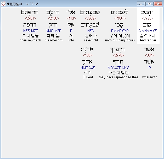 히브리어구약BHS,12 וְהָשֵׁב לִשְׁכֵנֵינוּ שִׁבְעָתַיִם אֶל־חֵיקָם חֶרְפָּתָם אֲשֶׁר חֵרְפוּךָ אֲדֹנָי׃