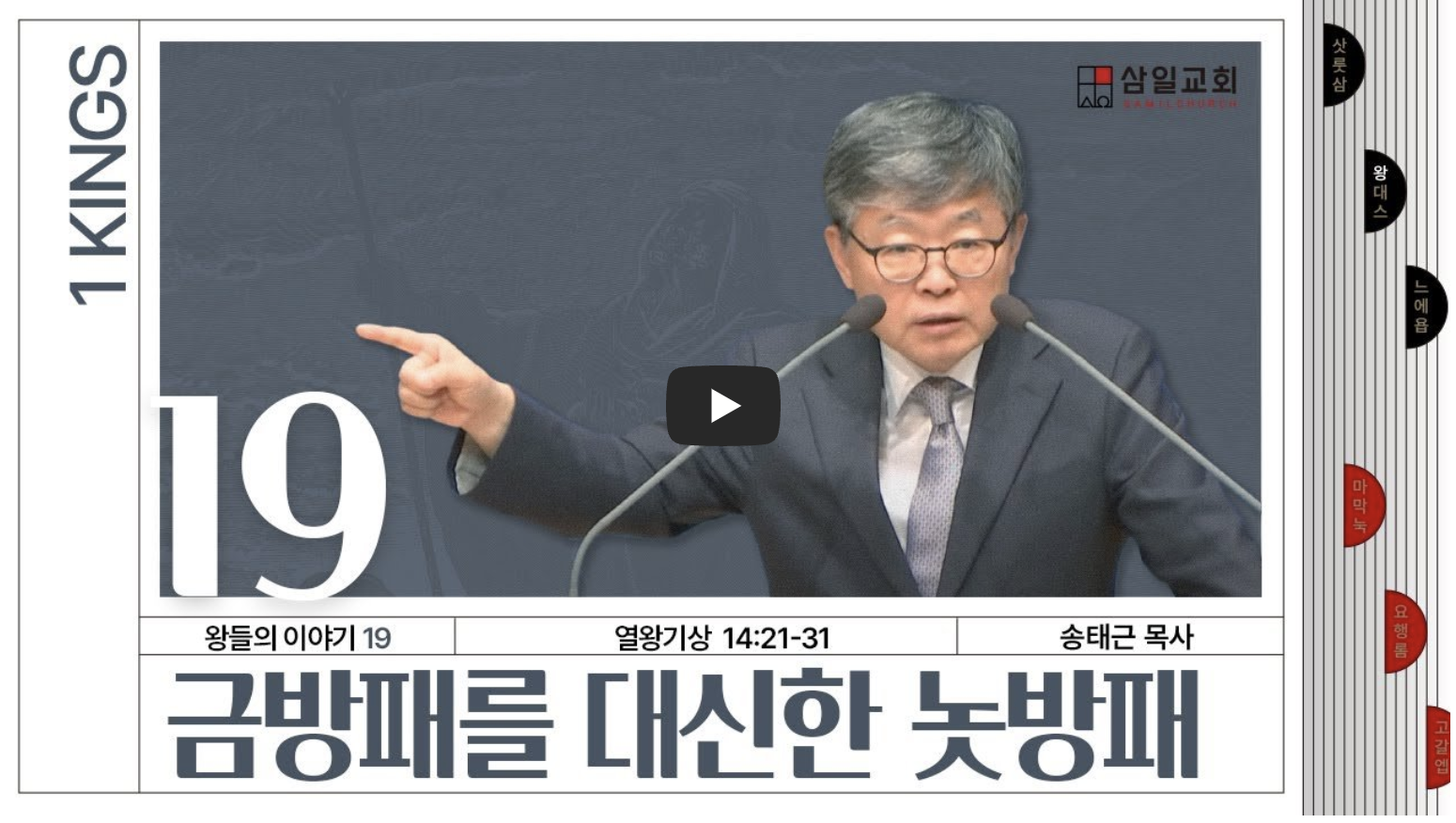 지난 주, 아비야라는 여로보암의 아들이 병들어 죽어 가고 있었습니다. 아내는 선지자에게 심부름을 보내 그의 예언을 듣고 싶었지만, 결과는 알려지지 않았습니다. 지난 5부에서 저는 이 이야기를 다루었죠. 오늘은 이야기가 유다로 전환되며, 유다의 첫 번째 왕인 솔로몬의 아들, 르호보암이 왕위에 오르는 사건을 나누겠습니다.