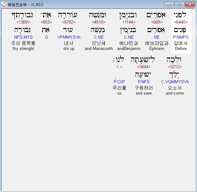 히브리어구약BHS,2 לִפְנֵי אֶפְרַיִם וּבִנְיָמִן וּמְנַשֶּׁה עֹורְרָה אֶת־גְּבוּרָתֶךָ וּלְכָה לִישֻׁעָתָה לָּנוּ׃