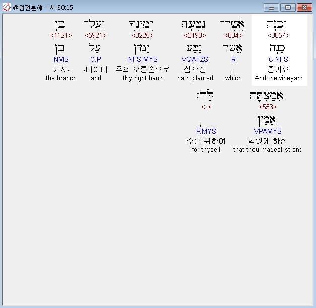 히브리어구약BHS,15 וְכַנָּה אֲשֶׁר־נָטְעָה יְמִינֶךָ וְעַל־בֵּן אִמַּצְתָּה לָּךְ׃
