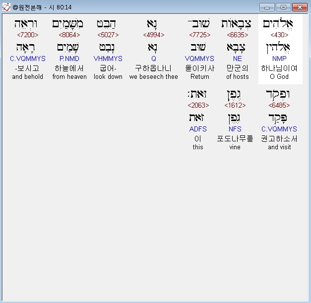 히브리어구약BHS,14 אֱלֹהִים צְבָאֹות שׁוּב־נָא הַבֵּט מִשָּׁמַיִם וּרְאֵה וּפְקֹד גֶּפֶן זֹאת׃