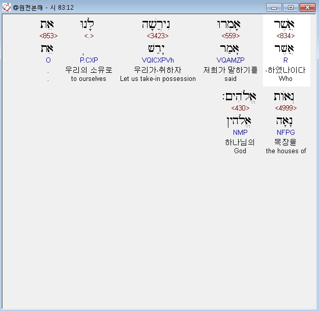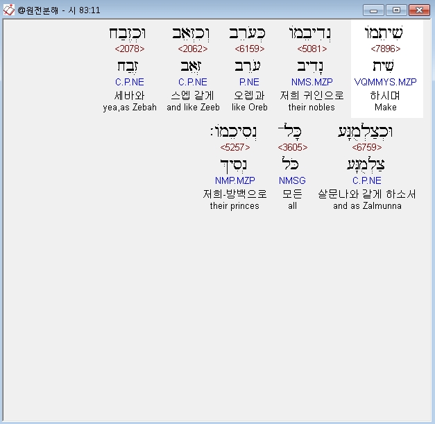| 히브리어 시편 84편 전체 원어 원문 성경 공부 주석 강해 설교 해설 해석 (0) | 2020.10.13 |