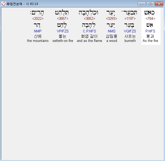 히브리어구약BHS,14 כְּאֵשׁ תִּבְעַר־יָעַר וּכְלֶהָבָה תְּלַהֵט הָרִים׃
