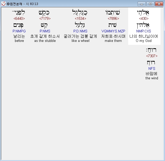 히브리어구약BHS,13 אֱלֹהַי שִׁיתֵמֹו כַגַּלְגַּל כְּקַשׁ לִפְנֵי־רוּחַ׃