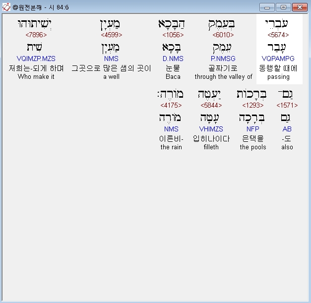 히브리어구약BHS,6 עֹבְרֵי בְּעֵמֶק הַבָּכָא מַעְיָן יְשִׁיתוּהוּ גַּם־בְּרָכֹות יַעְטֶה מֹורֶה׃