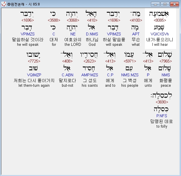 히브리어구약BHS,8 אֶשְׁמְעָה מַה־יְדַבֵּר הָאֵל יְהוָה כִּי יְדַבֵּר שָׁלֹום אֶל־עַמֹּו וְאֶל־חֲסִידָיו וְאַל־יָשׁוּבוּ לְכִסְלָה׃