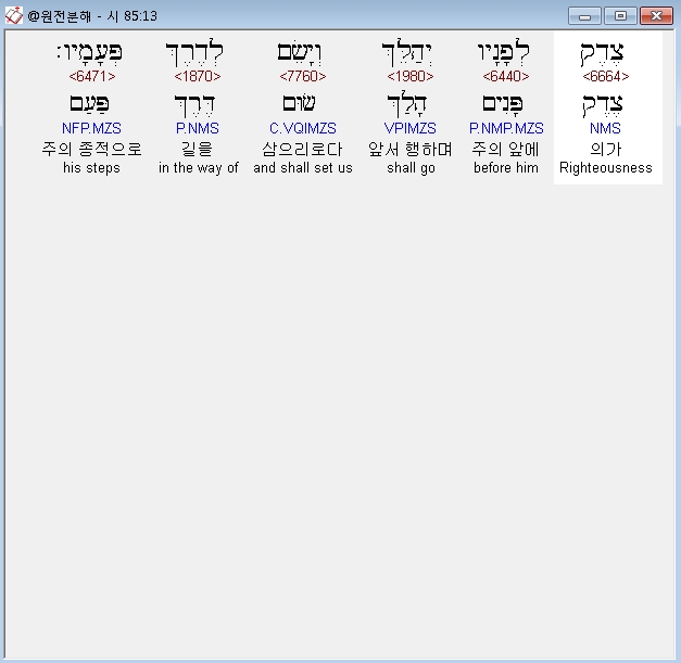 히브리어구약BHS,13 צֶדֶק לְפָנָיו יְהַלֵּךְ וְיָשֵׂם לְדֶרֶךְ פְּעָמָיו׃