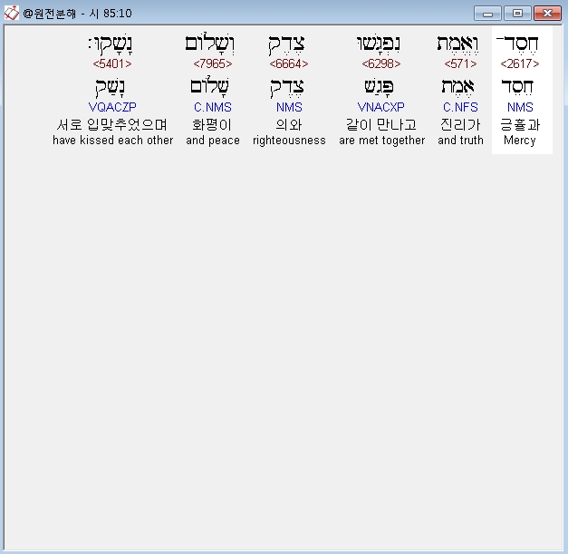 히브리어구약BHS,10 חֶסֶד־וֶאֱמֶת נִפְגָּשׁוּ צֶדֶק וְשָׁלֹום נָשָׁקוּ׃