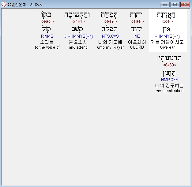 히브리어구약BHS,6 הַאֲזִינָה יְהוָה תְּפִלָּתִי וְהַקְשִׁיבָה בְּקֹול תַּחֲנוּנֹותָי׃