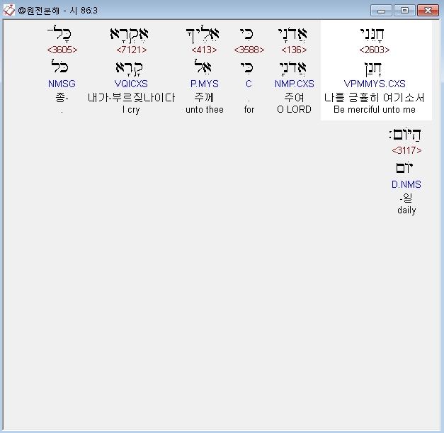 히브리어구약BHS,3 חָנֵּנִי אֲדֹנָי כִּי אֵלֶיךָ אֶקְרָא כָּל־הַיֹּום׃