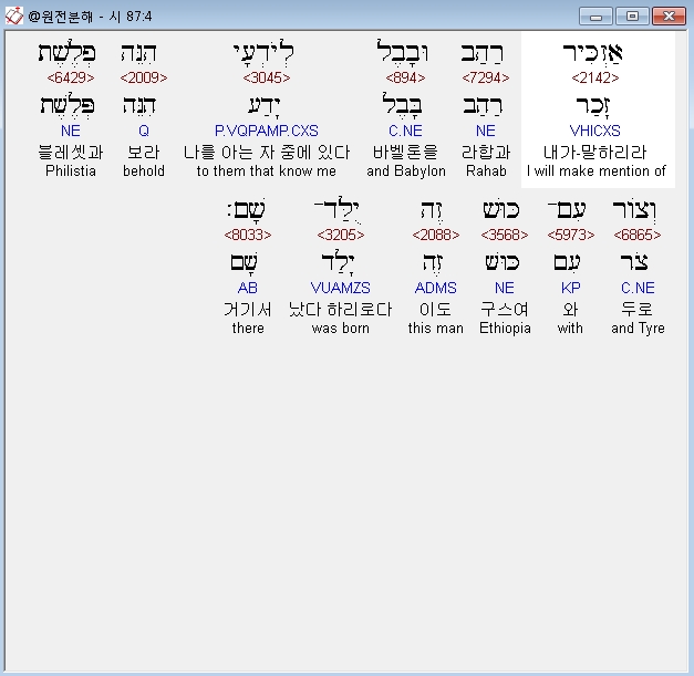 히브리어구약BHS,4 אַזְכִּיר רַהַב וּבָבֶל לְיֹדְעָי הִנֵּה פְלֶשֶׁת וְצֹור עִם־כּוּשׁ זֶה יֻלַּד־שָׁם׃