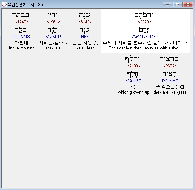 주께서 저희를 홍수처럼 쓸어 가시나이다 - '제람탐'(*)을 직역하면 '당신이 그들을 쓸어버리십니다'이다. '쓸어버리다'로 번역되는 용어로서 문맥상 지위 고하(高下), 나이 등을 상관하지 않고 죽음이 인간의 생명을 쓸어가버리는 것을 나타낸다. 그렇다면 이어지는 구절 '저희는 잠간 자는 것 같으며'는 동의적 구절로 보아 '저의는 죽은 존재와 같으며'로 번역할 수 있다.