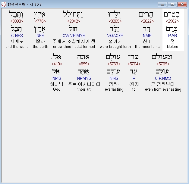 히브리어구약BHS,2 בְּטֶרֶם הָרִים יֻלָּדוּ וַתְּחֹולֵל אֶרֶץ וְתֵבֵל וּמֵעֹולָם עַד־עֹולָם אַתָּה אֵל׃