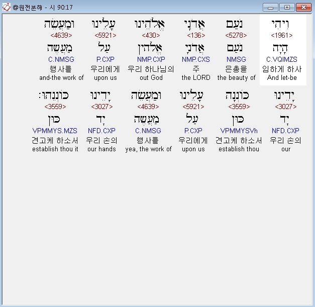 히브리어구약BHS,17 וִיהִי נֹעַם אֲדֹנָי אֱלֹהֵינוּ עָלֵינוּ וּמַעֲשֵׂה יָדֵינוּ כֹּונְנָה עָלֵינוּ וּמַעֲשֵׂה יָדֵינוּ כֹּונְנֵהוּ׃
