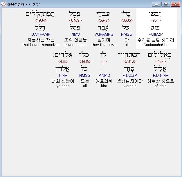 히브리어구약BHS,7 יֵבֹשׁוּ כָּל־עֹבְדֵי פֶסֶל הַמִּתְהַלְלִים בָּאֱלִילִים הִשְׁתַּחֲווּ־לֹו כָּל־אֱלֹהִים׃