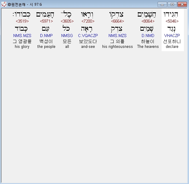 히브리어구약BHS,6 הִגִּידוּ הַשָּׁמַיִם צִדְקֹו וְרָאוּ כָל־הָעַמִּים כְּבֹודֹו׃