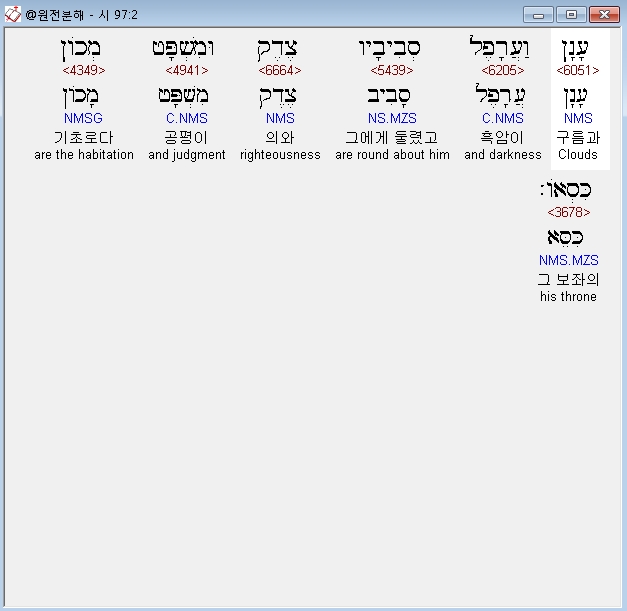 히브리어구약BHS,2 עָןָן וַעֲרָפֶל סְבִיבָיו צֶדֶק וּמִשְׁפָּט מְכֹון כִּסְאֹו׃