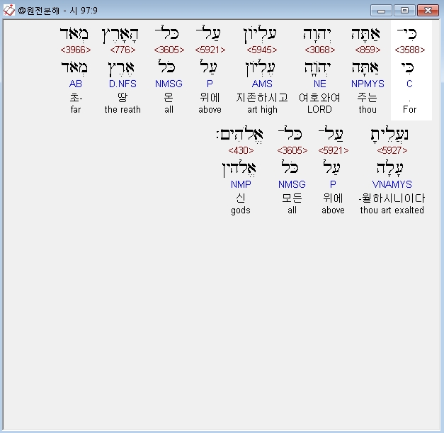 히브리어구약BHS,9 כִּי־אַתָּה יְהוָה עֶלְיֹון עַל־כָּל־הָאָרֶץ מְאֹד נַעֲלֵיתָ עַל־כָּל־אֱלֹהִים׃
