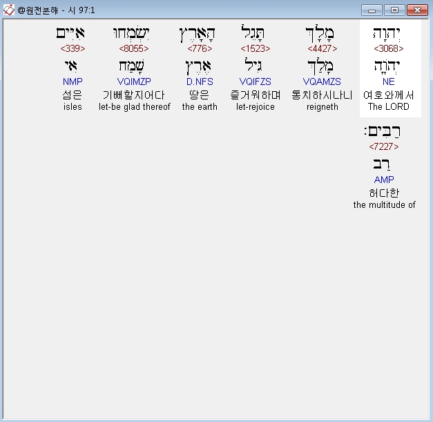 히브리어구약BHS,1 יְהוָה מָלָךְ תָּגֵל הָאָרֶץ יִשְׂמְחוּ אִיִּים רַבִּים׃