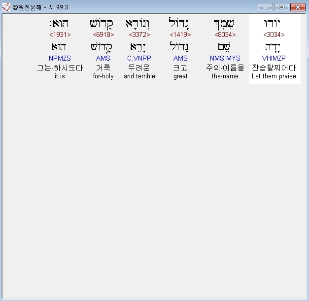 | 히브리어 시편 100편 전체 원어 원문 성경 공부 주석 강해 설교 해설 해석 (0) | 2020.10.13 |