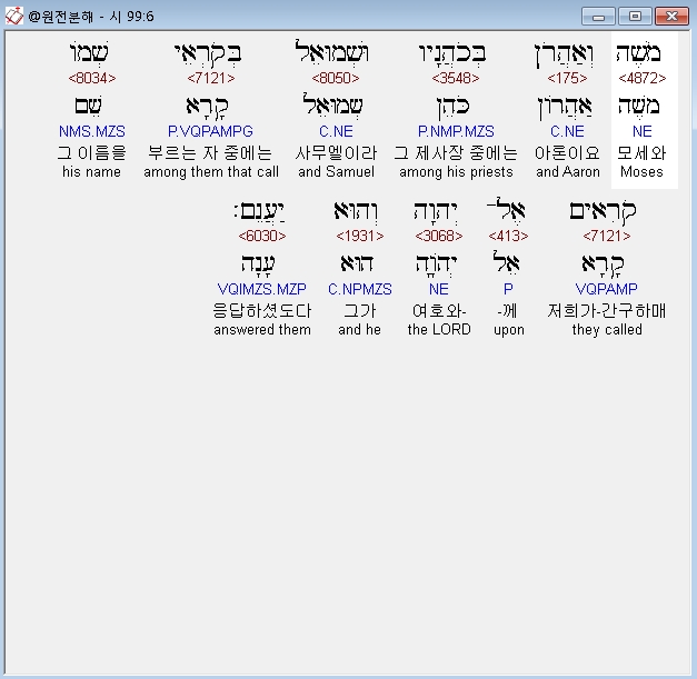 히브리어구약BHS,6 מֹשֶׁה וְאַהֲרֹן בְּכֹהֲנָיו וּשְׁמוּאֵל בְּקֹרְאֵי שְׁמֹו קֹרִאים אֶל־יְהוָה וְהוּא יַעֲנֵם׃