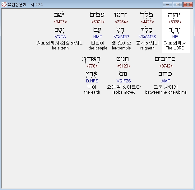 히브리어구약BHS,1 יְהוָה מָלָךְ יִרְגְּזוּ עַמִּים יֹשֵׁב כְּרוּבִים תָּנוּט הָאָרֶץ׃