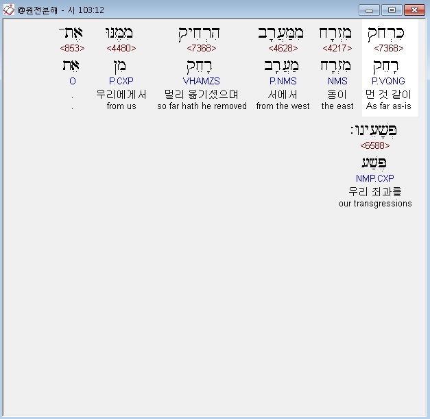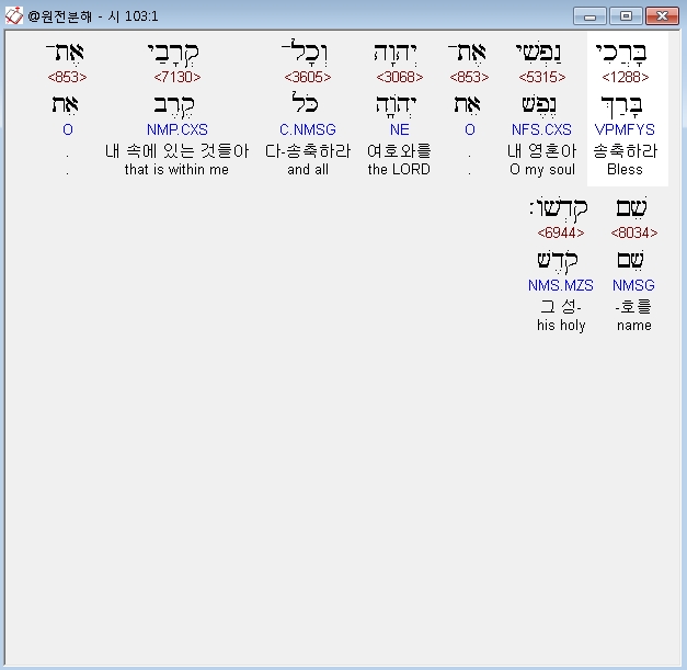| 히브리어 시편 105편 전체 원어 원문 성경 공부 주석 강해 설교 해설 해석 (0) | 2020.10.14 |