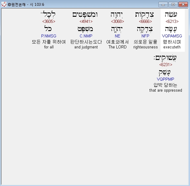히브리어구약BHS,6 עֹשֵׂה צְדָקֹות יְהוָה וּמִשְׁפָּטִים לְכָל־עֲשׁוּקִים׃