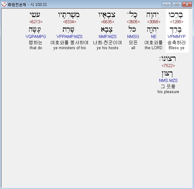 히브리어구약BHS,21 בָּרֲכוּ יְהוָה כָּל־צְבָאָיו מְשָׁרְתָיו עֹשֵׂי רְצֹונֹו׃