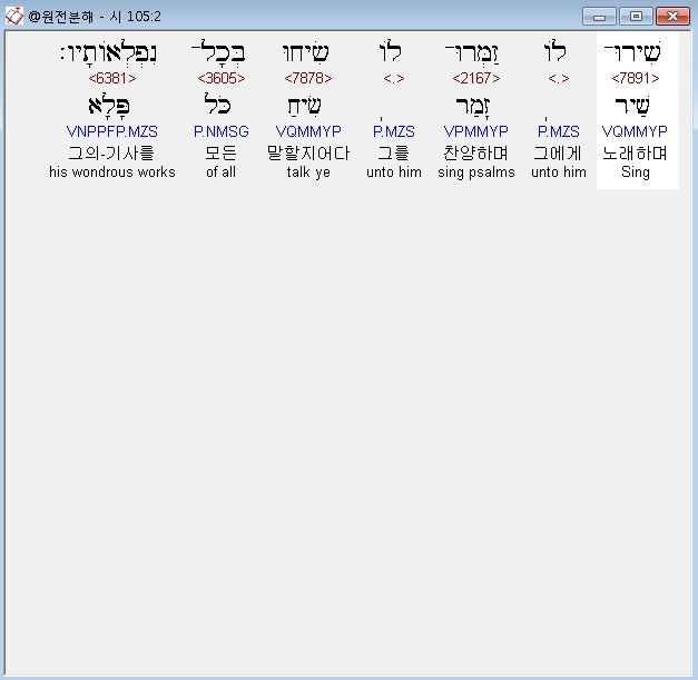 히브리어구약BHS,2 שִׁירוּ־לֹו זַמְּרוּ־לֹו שִׂיחוּ בְּכָל־נִפְלְאֹותָיו׃