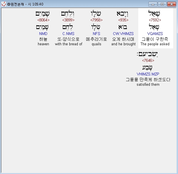 히브리어구약BHS,40 שָׁאַל וַיָּבֵא שְׂלָו וְלֶחֶם שָׁמַיִם יַשְׂבִּיעֵם׃