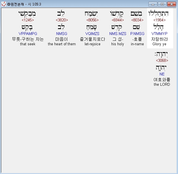 히브리어구약BHS,3 הִתְהַלְלוּ בְּשֵׁם קָדְשֹׁו יִשְׂמַח לֵב מְבַקְשֵׁי יְהוָה׃