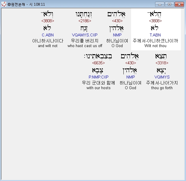 히브리어구약BHS,11 הֲלֹא־אֱלֹהִים זְנַחְתָּנוּ וְלֹא־תֵצֵא אֱלֹהִים בְּצִבְאֹתֵינוּ׃