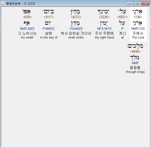 히브리어구약BHS,5 אֲדֹנָי עַל־יְמִינְךָ מָחַץ בְּיֹום־אַפֹּו מְלָכִים׃