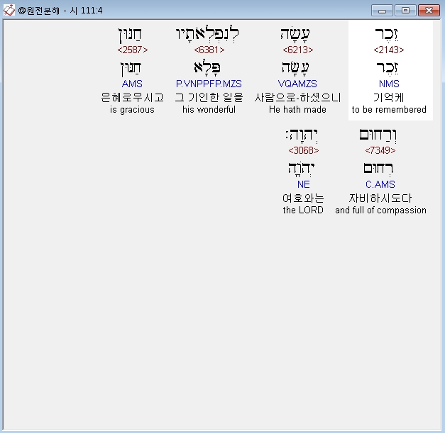 히브리어구약BHS,4 זֵכֶר עָשָׂה לְנִפְלְאֹתָיו חַנּוּן וְרַחוּם יְהוָה׃