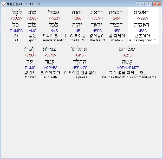 히브리어구약BHS,10 רֵאשִׁית חָכְמָה יִרְאַת יְהוָה שֵׂכֶל טֹוב לְכָל־עֹשֵׂיהֶם תְּהִלָּתֹו עֹמֶדֶת לָעַד׃