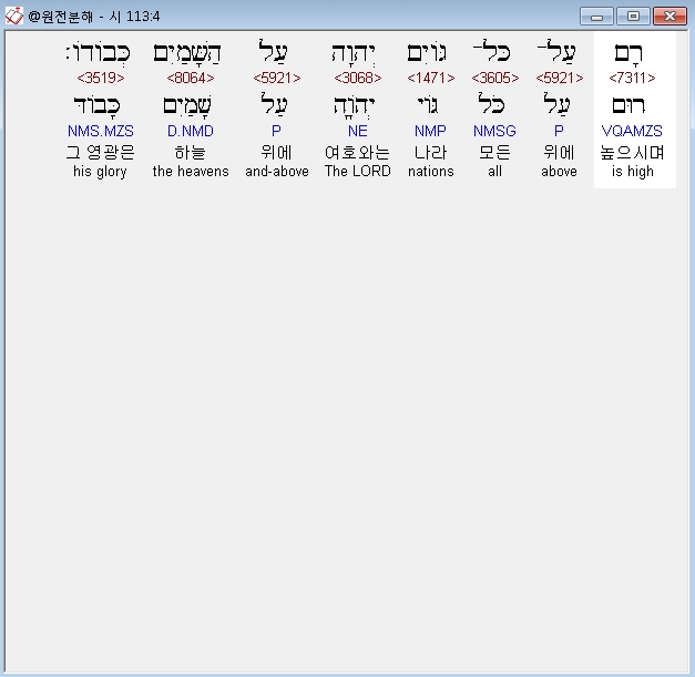 히브리어구약BHS,4 רָם עַל־כָּל־גֹּויִם יְהוָה עַל הַשָּׁמַיִם כְּבֹודֹו׃