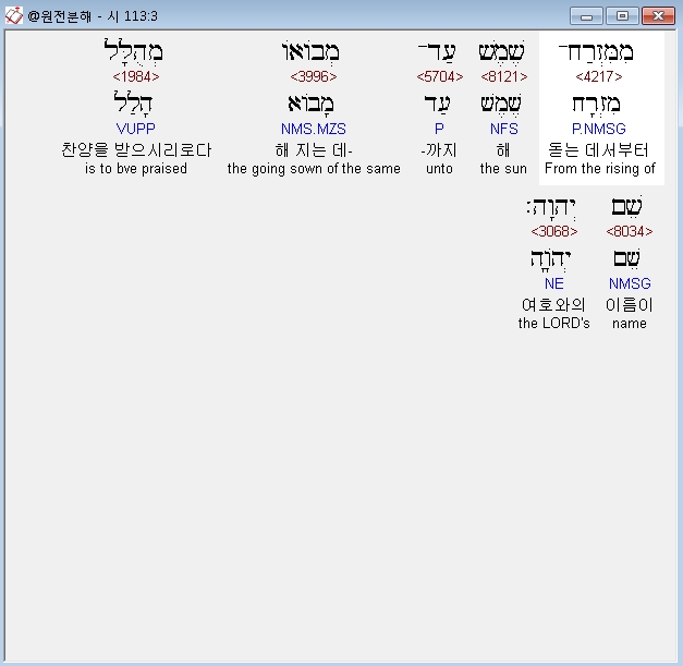 히브리어구약BHS,3 מִמִּזְרַח־שֶׁמֶשׁ עַד־מְבֹואֹו מְהֻלָּל שֵׁם יְהוָה׃