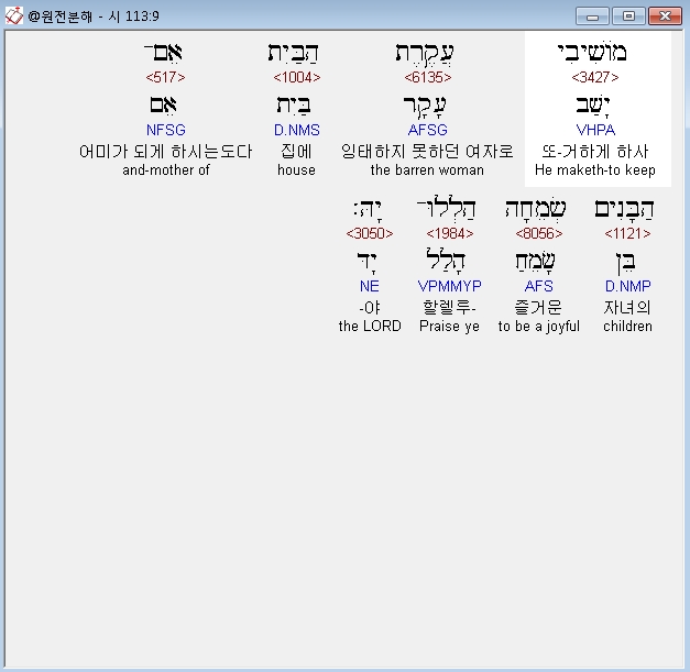 히브리어구약BHS,9 מֹושִׁיבִי עֲקֶרֶת הַבַּיִת אֵם־הַבָּנִים שְׂמֵחָה הַלְלוּ־יָהּ׃