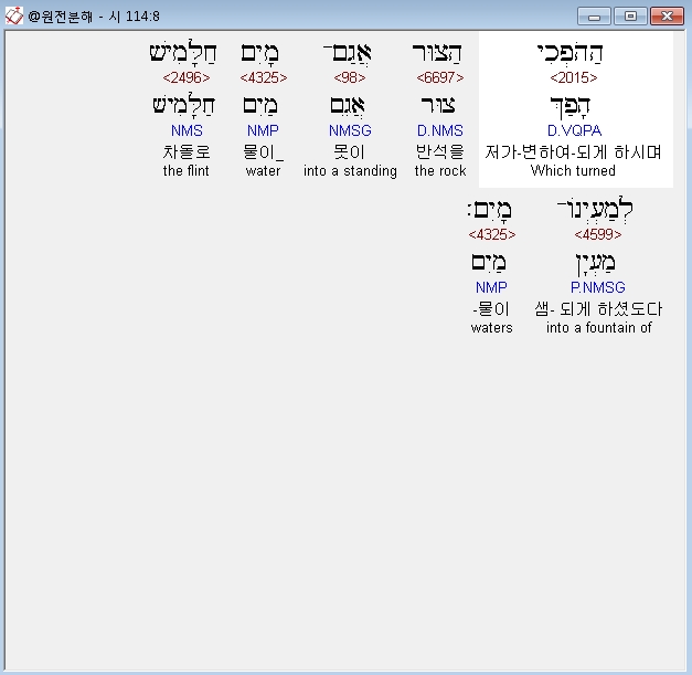 히브리어구약BHS,8 הַהֹפְכִי הַצּוּר אֲגַם־מָיִם חַלָּמִישׁ לְמַעְיְנֹו־מָיִם׃