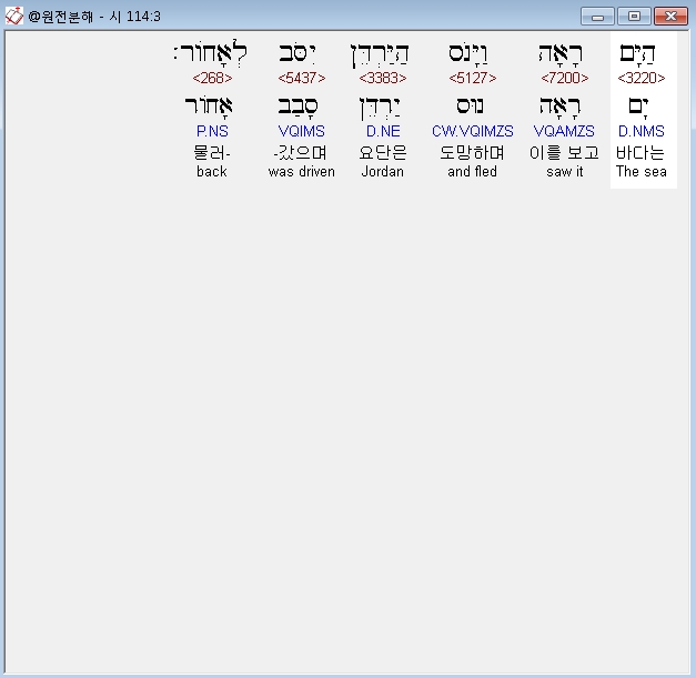 바다는 이를 보고 도망하며(*, 하얌 라아 와야노스) - 직역하면 '그 바다는 보았고 그리고 달아났다'이다. 여기서 '바다'는 홍해를 가리킨다는데에 대부분의 주석가들은 동의하고 있다. 그리고 '보다'에 해당하는 '라아'는 직접목적어를 취하는 타동사이지만 여기서는 그것이 빠져 있다. 그래서 어떤 주석가는 여기에 대명사 접미어를 첨가하여 이를 '라아후'(*)로 읽는 것이 좋을 것이라고 주장한다. 그럴 경우 하나님의 임재를 내포하는 언약궤나 여호와의 권능 등의 개념이 목적어 역할을 한다는 것이다.