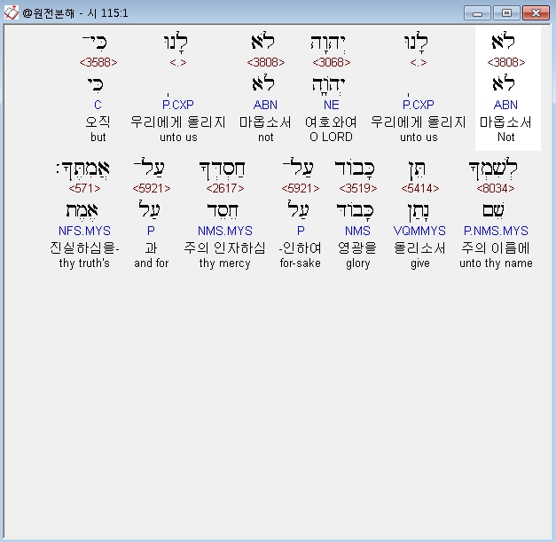 히브리어구약BHS,1 לֹא לָנוּ יְהוָה לֹא לָנוּ כִּי־לְשִׁמְךָ תֵּן כָּבֹוד עַל־חַסְדְּךָ עַל־אֲמִתֶּךָ׃