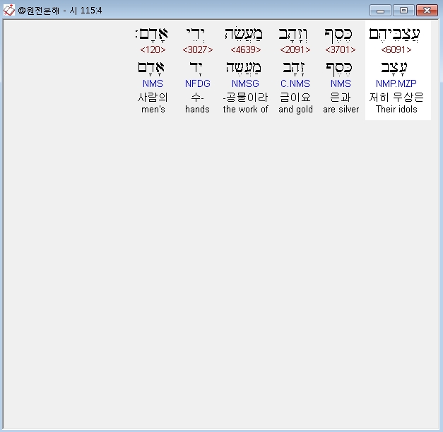 히브리어구약BHS,4 עֲצַבֵּיהֶם כֶּסֶף וְזָהָב מַעֲשֵׂה יְדֵי אָדָם׃