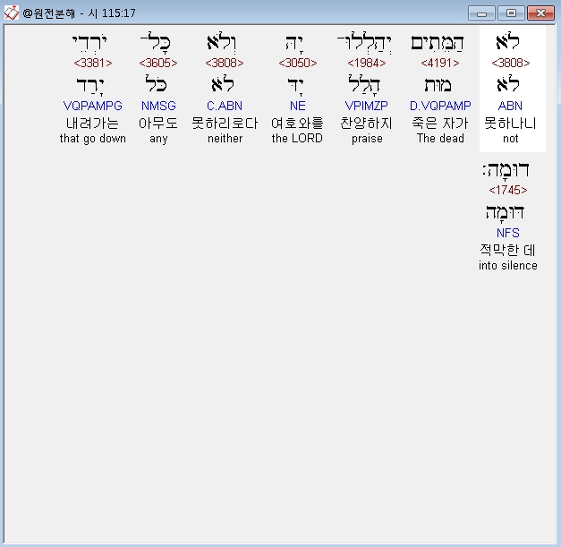 히브리어구약BHS,17 לֹא הַמֵּתִים יְהַלְלוּ־יָהּ וְלֹא כָּל־יֹרְדֵי דוּמָה׃
