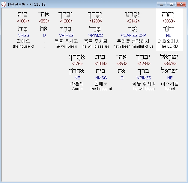 히브리어구약BHS,12 יְהוָה זְכָרָנוּ יְבָרֵךְ יְבָרֵךְ אֶת־בֵּית יִשְׂרָאֵל יְבָרֵךְ אֶת־בֵּית אַהֲרֹן׃